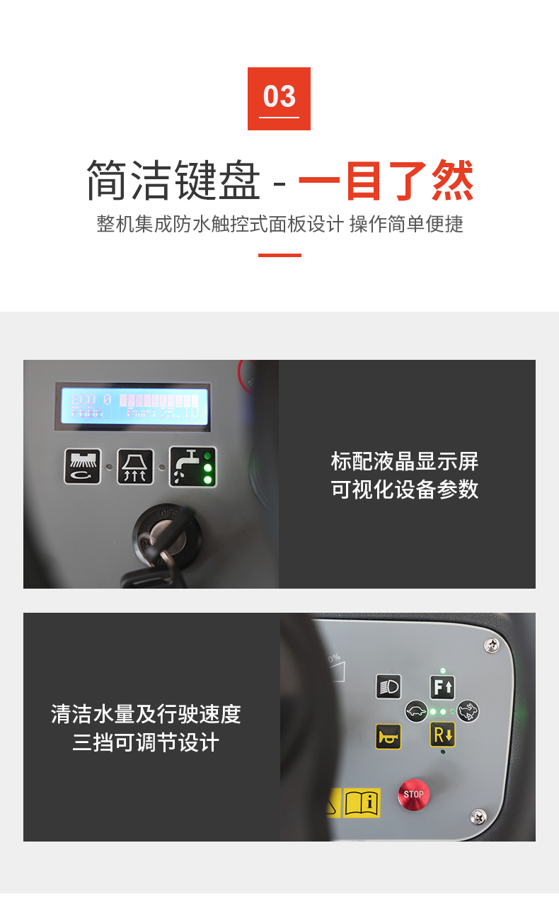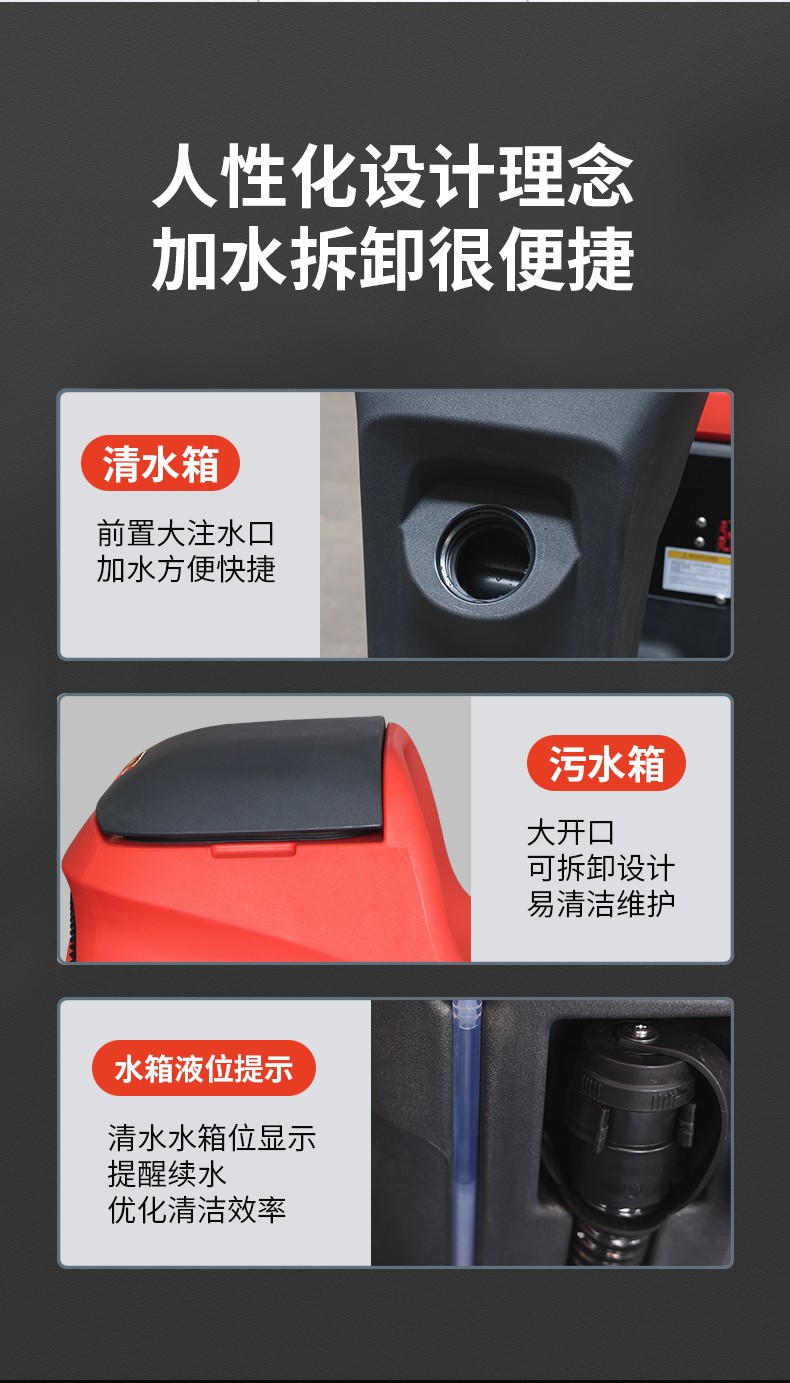 ● 刷盤、水刮架一鍵電動(dòng)升降,倒車水刮架自動(dòng)抬升
