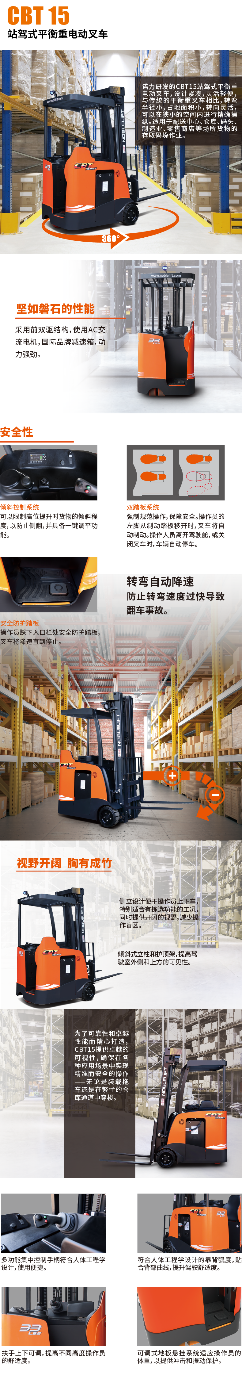 諾力站駕式平衡重電動叉車CBT15,設計緊湊,靈活輕便,與傳統的平衡重叉車相比,轉彎半徑小,占地面積小,轉向靈活,可以在狹小的空間內進行操縱。適用于配送中心、倉庫、碼頭、制造業(yè)、零售商店等場所貨物的存取碼垛作業(yè)。